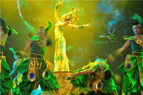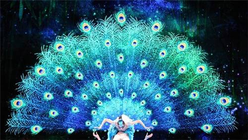 “清风吹拂,细雨轻飘,是孔雀飞来了;芦笙声声,歌声悠扬,是孔雀飞来了;芦花绽放,木棉红透,是孔雀飞来了……”伴随着欢快优美的象脚鼓与铓锣声,舞者身着傣族孔雀舞演出服出场,步伐轻快,轻梳羽毛,随风起舞,给傣族村寨带来祥和、带来幸福。这就是傣家独有的孔雀舞所表现和营造的舞蹈意象。