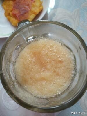 2. 准备一个苹果,一个梨,去皮后切成细丝,放在料理杯里打成泥。加入这两种水果以后,腌出来的泡菜不仅味道鲜,还有一股水果的清香味。把姜丝和蒜瓣一起加入到料理杯内,打成泥备用。450克清水内加入50克糯米粉,放锅里小火煮成浆糊,然后把浆糊放凉备用。