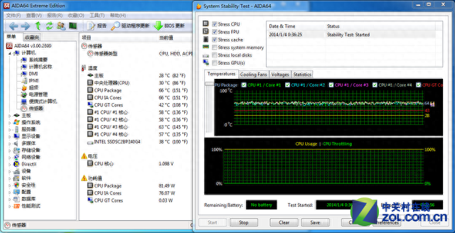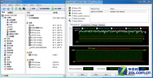 由于默频的提升以及超频性能的优化,使得i7-4790K在TDP上为88W,高出i7-4770K的84W,但提升幅度并不大,并不像AMDFX-9590那样TDP直接飙升至220W。而在实际使用上二者的功耗有多大差距呢?为此我们采用功耗仪对整个平台的功耗进行监测。我们使用AIDA64系统稳定性测试对平台进行满载操作,对CPU、FPU及Cache进行压力测试。