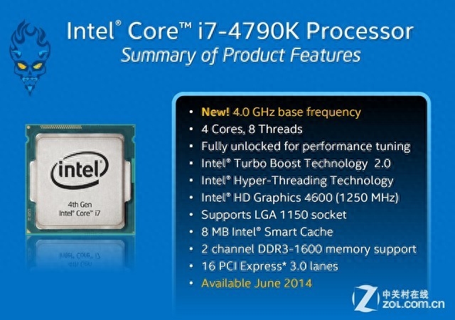 加了个Refresh也无非就是微微提升下频率,这样的举措显然无法让挑剔的消费者满意。不过在6月的台北电脑展上,Intel放出了杀招:核心代号为“Devil's Canyon(恶魔峡谷)”的Haswell Refresh倍频解锁(带K)处理器i7-4790K和i5-4690K发布了。前者相对于i7-4770K的频率提升可不仅仅只有100、200MHz——i7-4790K处理器的默认频率就高达4GHz!