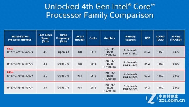 从图中我们可以看出,i7-4790K相较i7-4770K在频率上有所提升,功耗也从后者的84W小幅提升到了88W,这个涨幅还是可以接受的,比起FX-9590的220W优势明显。而i5-4690K相比i5-4670K在默频和睿频方面分别提升了100MHz,幅度不大,TDP与i7-4790K同为88W。由于i7-4790K与i5-4690K的售价均保持了与原i7-4770K和i5-4670K不变,因此i7-4790K与i5-4690K将会取代i7-4770K与i5-4670K的位置。