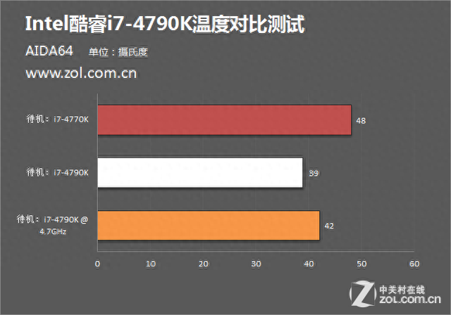 在待机温度的对比上,实际测试结果有些出乎我们的意料。i7-4790K在默频情况下待机温度只有39℃,反观i7-4770K竟然高达48℃。而i7-4790K即使在超频情况下的待机温度也只有42℃而已,仍远低于i7-4770K默频的48℃。