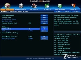*需要特别说明的是:由于技嘉Z97X-SOC Force在BIOS中无法将i7-4790K调节为默认状态4.0GHz下正常开启睿频模式(如果CPU Ratio调节为40则睿频无法开启;如果Ratio设置为AUTO则默认为4.4GHz恒定),因此迫不得已,我们只得将i7-4790K默认情况下4颗核心的倍频手动设置为44/44/43/42,望广大读者悉知,也希望技嘉在将来的BIOS版本中将该BUG改进!