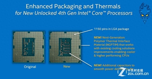 为了改善这一情况,Intel特意在Devil's Canyon处理器上做了重新的设计,其中包括采用了全新的NGPTIM(下一代聚合物散热界面材料)及在CPU背部增加了更多的电容元器件。散热介质的改变保证了CPU DIE与顶盖拥有绝佳的导热效率,而电容元件的增加则让核心拥有更加平顺的电流供给,更强的电气性才有助于CPU发挥更好的超频性能。