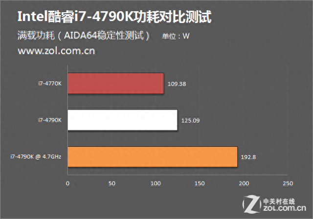 我们选取了i7-4770K默频、i7-4790K默频以及i7-4790K超频至4.7GHz这三种情况下的待机及满载功耗共6项数据作为参考,具体如下: