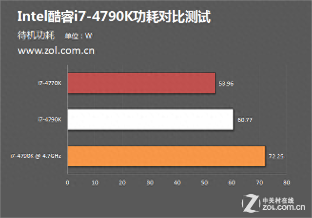 在待机功耗上,i7-4790K为60.77W,略高于i7-4770K的53.96W。而由于加压的缘故,超频至4.7GHz的i7-4790K的待机功耗稍高,为72.25W。