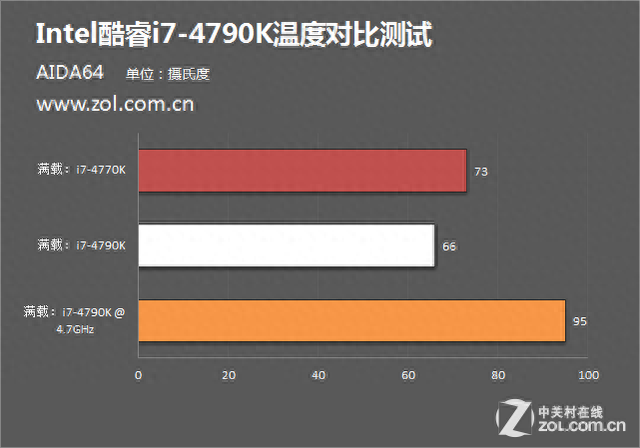 而在整机满载后,默频下的i7-4790K同样有着优异的表现,66℃的温度同样低于i7-4770K的73℃。不过在超频到4.7GHz后,i7-4790K的满载温度飙升至95℃。尽管95℃的温度表现并不能算是很好,不过毕竟在超至高频并加压后势必会带来热量的激增,且从无论在默频待机还是满载状态下温度表现都要好于i7-4770K的情况来看,i7-4790K在超频后的温度表现必然好于i7-4770K。