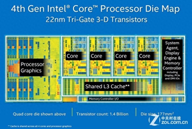 i7-4790K的核心架构同之前的Haswell处理器一样,配有图形处理器,4核心,共享L3缓存区,显示引擎,内存控制器及I/O等。