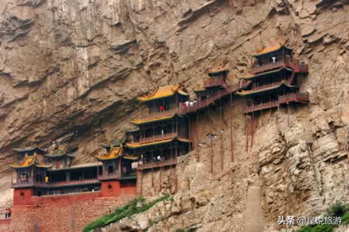 自金龙口入金龙峡,行不里许,便见一处神奇的空中楼阁悬挂在峡谷西侧的悬崖峭壁间,它便是悬空寺。建在翠屏峰一道绝壁的半山腰。上载危岩,下临深谷,结构巧妙,造型奇特。远远望去,只见神楼仙阁,凌空危挂,丹廊朱户,傍崖飞栖,像是玲珑剔透的雕刻,镶嵌在万仞峭壁间。