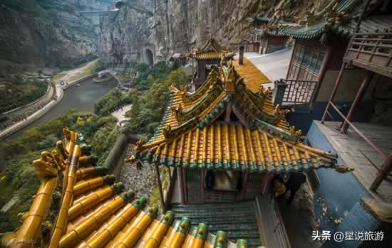它背依秀丽的翠屏峰,面对恒山主峰天峰岭,上载危崖,下临深谷,结构奇巧而惊险,楼阁悬空。当年悬空寺最高处三教殿距峡谷底部的高度曾为90余米,经过1500年峡谷河床的沙石沉积,现高度仍有40余米。