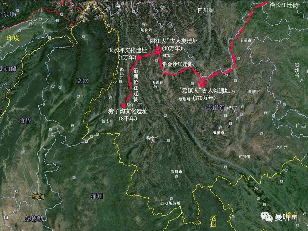1、迁徙说。其中影响最大的一种说法为”南下说”,该说法认为傣族源于川北陕南地区、阿尔泰山地区等中国北方或更远的地方,在其他民族的驱逐下不断南下,在迁徙的过程中,傣族一度停留在了云南,并建立起了南诏王国,在忽必烈平大理以后,傣族被迫继续南迁至云南南部及东南亚一带,该观点由于研究的深入已被越来越多的学者所放弃。其他还有起源于印度尼西亚群岛、两广云贵地区等说法。随着对傣族民族文献研究的深入,迁徙说得到了越来越多证据的支撑,如《本勐傣泐西双邦》、《西贺勐龙》、《巴沙坦》等,这些文献显示傣族居住区的土著主要为拉瓦人、克木人、孟人、孔人等,傣族为后来迁徙进入的。一些学者从语言学角度出发,提出了傣族先民曾与壮族先民在同一个地域生活的观点,认为傣族是从广西地区迁出的,但郑晓云认为由于不同族源的民族使用同一语言的原因有很多,这一研究方法并不能说明傣族的起源 。