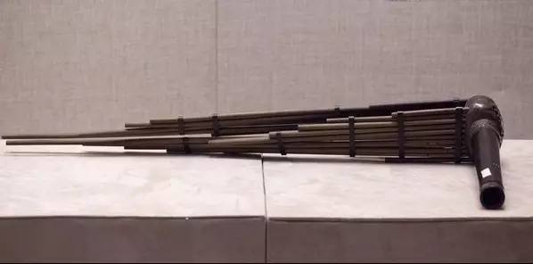 竽,古簧管乐器,形似笙而较大,管数亦较多。战国至汉代曾广泛流传。原三十六管,后减至二十三管,通高78厘米。竽斗、竽嘴木制,髹绛色漆。设二十二根管,系用直径约0.8厘米的竹管刮制而成,最长者78厘米、最短者14厘米。分前后两排插在竽斗上,每排十一根,用四至五道蔑箍加以固定。上端系一条绛色罗绮带为饰,前排一根长竽管上端插有一个角质的“塞”。此竽管及其相邻一根长竽管下端都有两个按音孔,靠近两管内侧的竽斗上有两圆孔。后排两根长管也同此情形。参照1972年长沙马王堆一号汉墓中出土的竽(明器)有二十二管,分前后两排。推测它们可能是为折叠管而设置的。