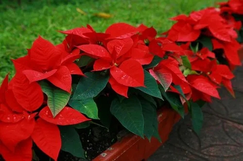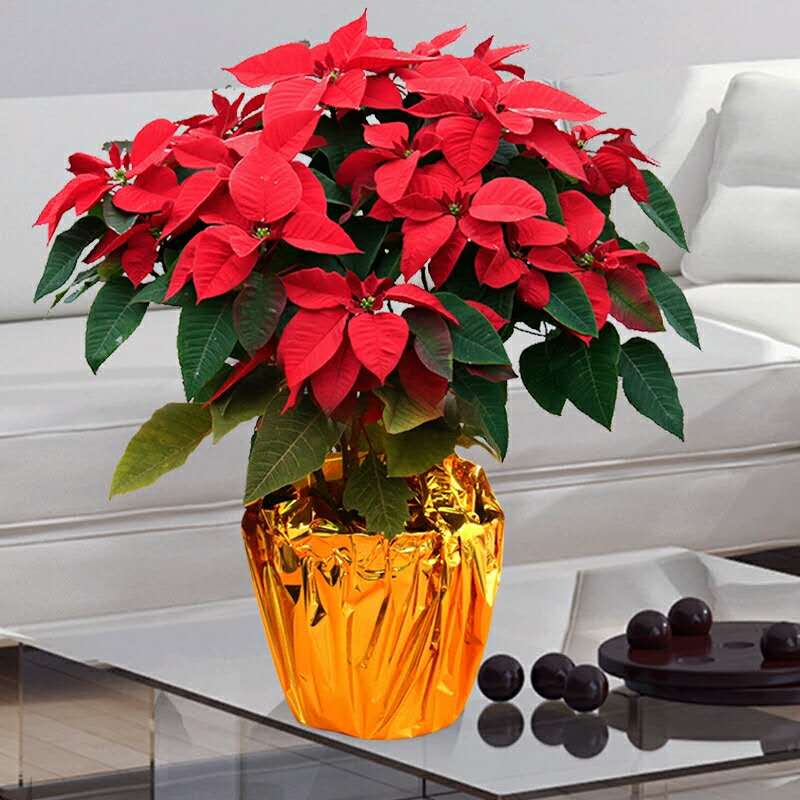 一品红的花朵在顶端,是红艳艳的颜色,向来是代表中国喜欢的红色。尤其是在过年的时候,很多人会在家里摆上几大盆红红红火火的盆栽,显得特别喜庆,一品红正是这样象征着吉祥如意的年宵花卉。