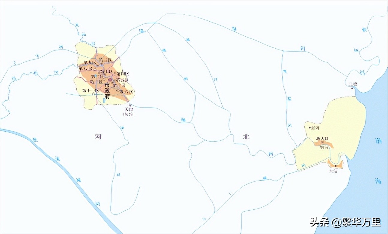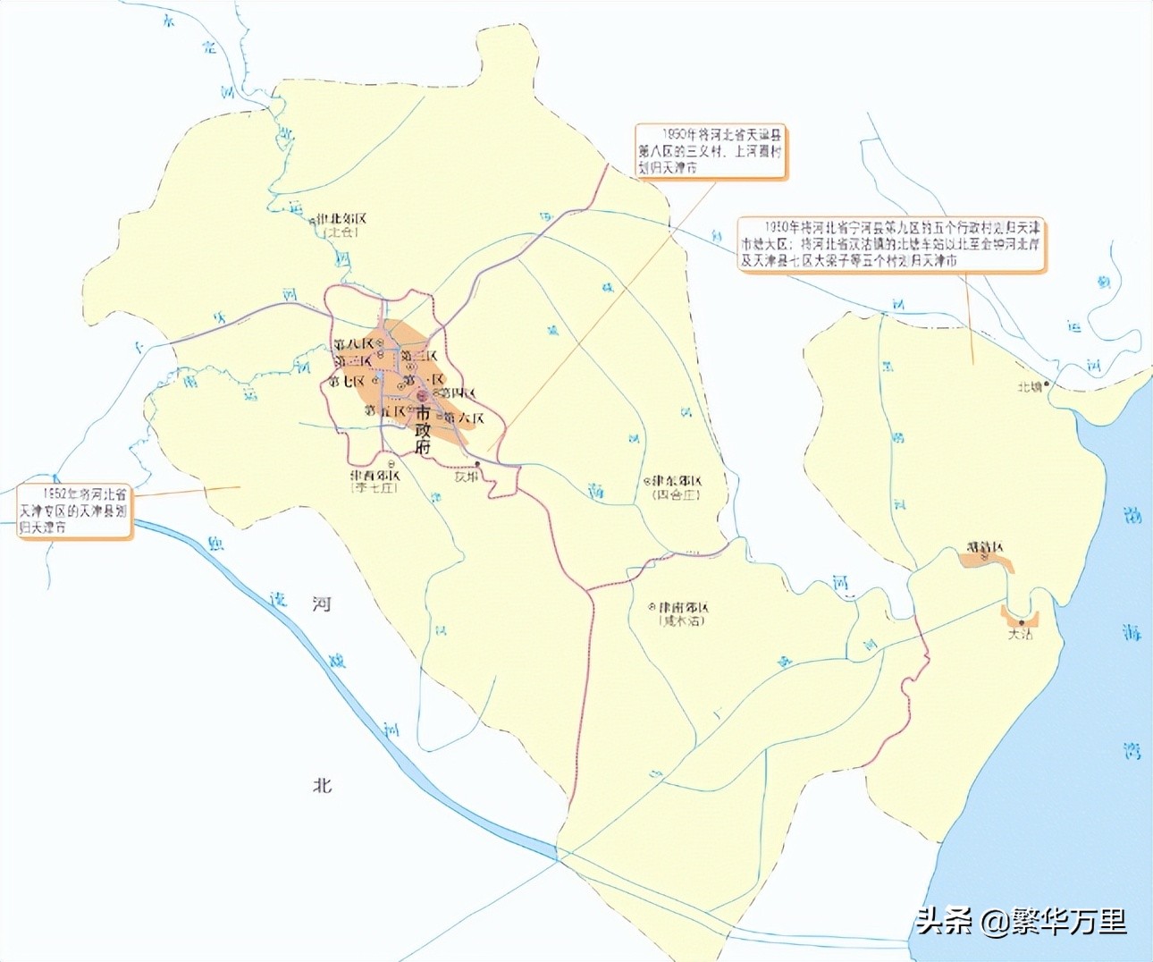 在50年代初期,天津市的主城区划分为8个区,从第一区排列到第八区。1952年,天津市组建了塘沽区。同一年,河北省天津专区下辖的天津县,划入了天津市管理。当时的区划很有意思,天津市管理主城区,外围的各个县隶属于天津专区管理,而天津专区隶属于河北省。1953年,天津县被撤销,设立了津西、津东、津南、津北4个郊区。