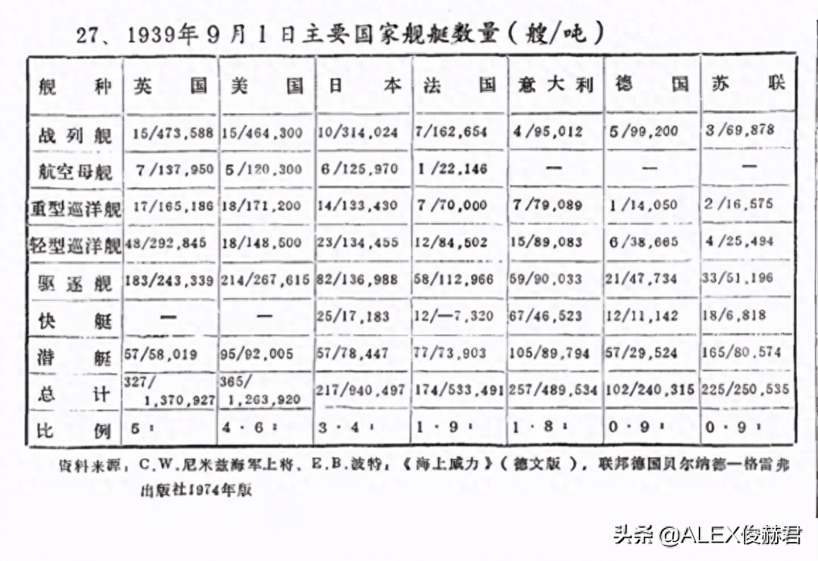 此时的日本海军总吨位相对于美国海军的近80%,不过因为美国是两洋部署,因此太平洋上海军实力只有一半,单一方向上的海军总兵力是弱于日本海军的,而此时的海军第一,一般认为仍是英国海军,虽然主力战列舰数量和总吨位都少于美国,也无法像一战前,以271.4万吨超越海军第二德国和第三美国之和,不过二战前,英国拥有世界最大的商船队,总吨位达到2000万吨,占当时世界的三分之一,更注重海上航线的英国海军在巡洋舰等护航战舰方面仍占据非常大的优势,也没有美国那样“平分”的两洋部署需求。