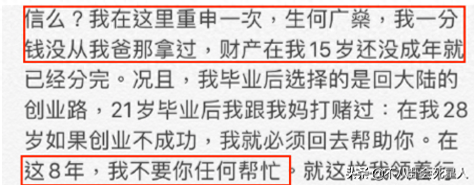 何猷君还说自己毕业出来就开始创业,四太曾经要把一间50亿的公司给他打理,但他拒绝了,并且和四太约定,在他28岁之前如果没有创业成功,就回家帮四太打理生意。