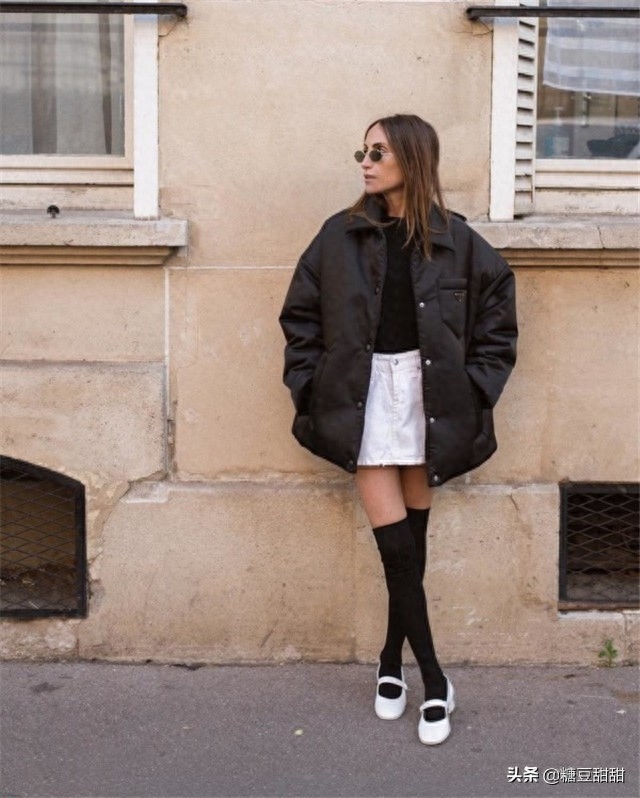 如果是一整套黑色的穿搭那么会很单调,这时候我们可以把短裙和过膝袜的颜色不一样,搭配一件白色的短裙就把整体提亮了不少,而且与小白皮鞋相呼应。