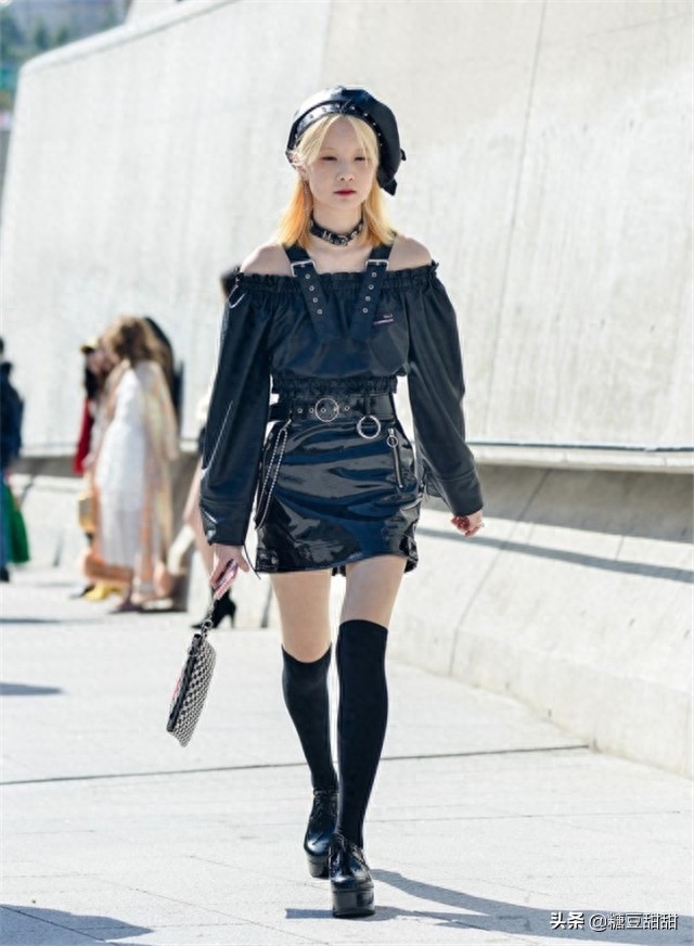 关键是黑色的过膝袜可以把腿部显得很瘦,当然过膝袜还具有塑造腿型的作用。喜欢酷帅风格的,那么就可以把黑色与金属融于一起。