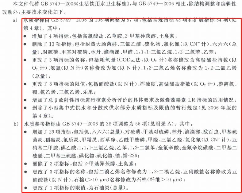而在明年4月即将正式执行的GB 5749-2022《生活饮用水卫生标准》中,相比较于已经执行15年GB 5749-2006标准中,又新增和更改了多项指标条例,这也说明了我国对居民用水水质的要求随着生活水平的提高和消毒方式的进步也变得越来越严格。