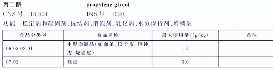 而其实丙二醇也会使用到我们的日常食物的食品添加剂使用标准中,丙二醇作为稳定剂和凝固剂,抗结剂,消泡剂,使用在生湿面制品,比如说面条,饺子皮,云吞皮,烧卖里面。