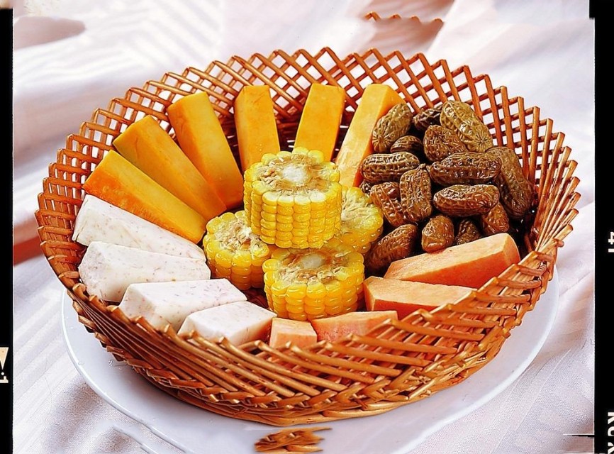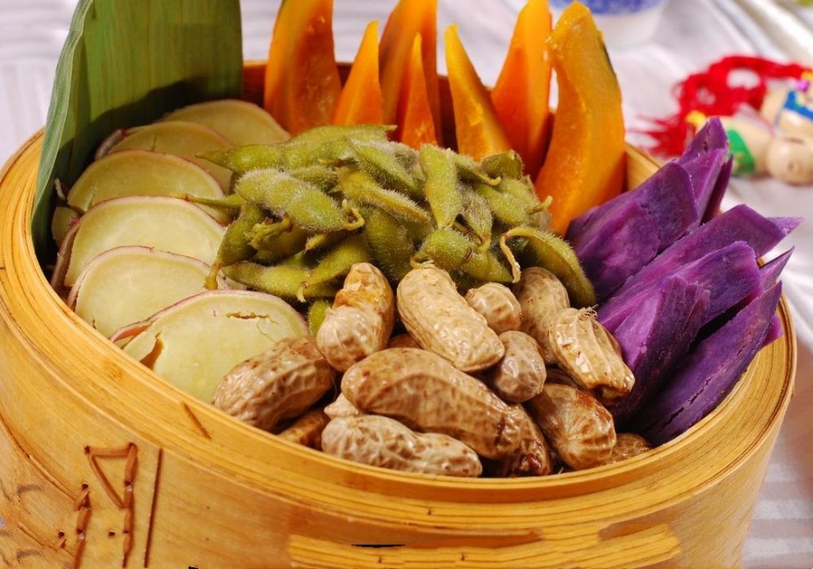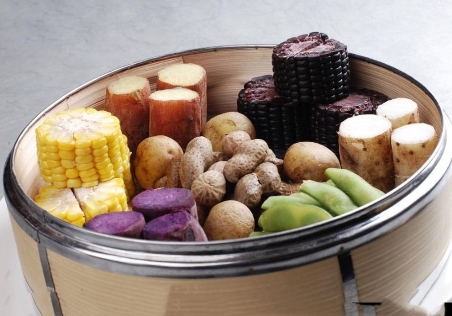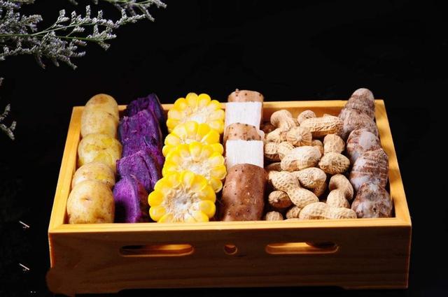1、这道菜很简单,但是在材料方面却选最好的东西,玉米有糯玉米和水果,玉米水果,玉米非常的甜,孩子都喜欢吃糯玉米的花城人,偏喜欢的多一点。玉米的选择方面完全是根据个人的喜好去选择。紫薯尽量选小一点的次数,这样可以整个摆进盘子里,不破坏菜品美观。山药可以选粗细均匀一点的洗干净,不要去皮。花生一定要选带壳的。毛豆的选择完全是在于自己。装五谷丰登的盘子最好是用蒸笼或者木制的篮子来装,这样更显得高端大气上档次,更接地气。