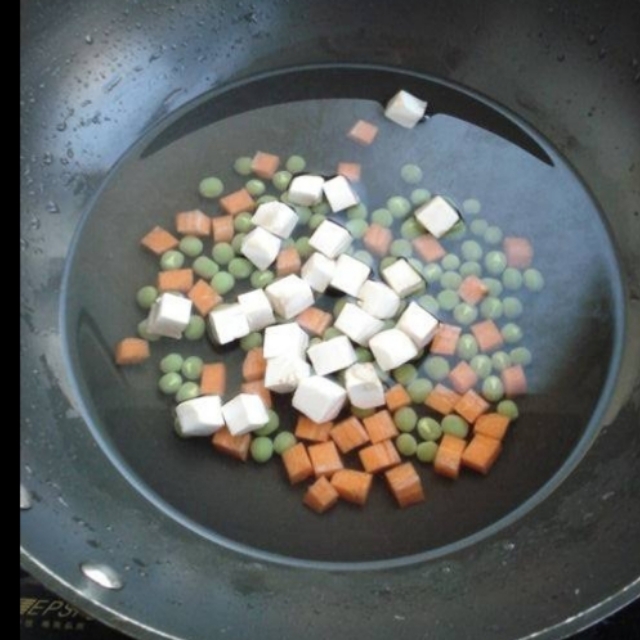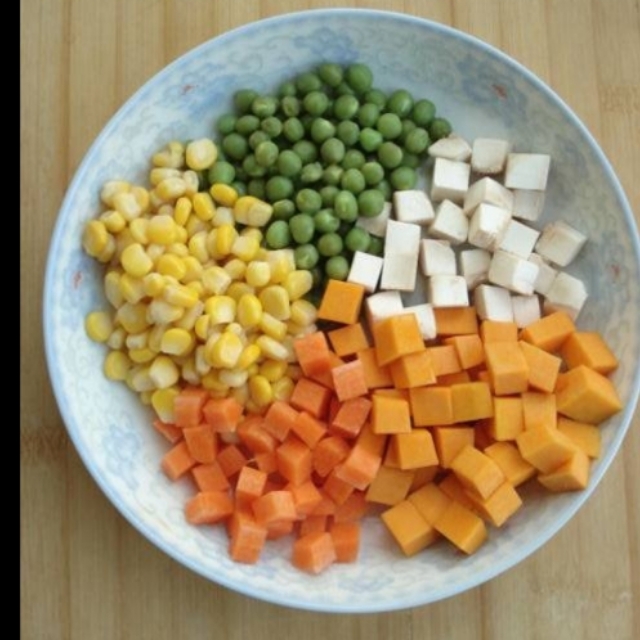 1、红薯,胡萝卜,口蘑切成相同大小的颗粒。然后锅中烧水开水下入胡萝卜,口蘑和红薯还有青豆。(要先下胡萝卜和口蘑,还有红薯,青豆,等这三样在水中烧熟过后再加入其他几样剩下的原料,因为这几样东西是熟的比较慢的,如果一起放进去的话,其他的都已经熟了,他们还没熟)