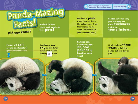 刚出生的大熊猫宝宝是粉红色的,这种颜竟然来自于妈妈舔它们时流出的唾液?! 大熊猫宝宝在三岁以后才能分得出是公的还是母的?! 大熊猫的英文名真的可以叫Bear Cat?! 大熊猫每天用生命在干的事情竟然是”吃饭”?!