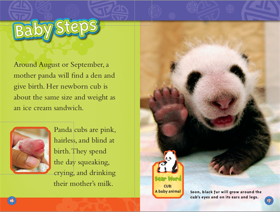 大熊猫刚出生时是粉红色的,没有毛,也看不见东西。它们每天都在哭叫和喝妈妈的奶中度过。慢慢地,大熊猫宝宝的眼睛周围、耳朵上和腿上就会长出黑色的软毛。