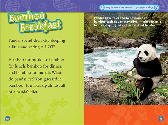 大熊猫可是个标准的”吃货”,每天睡得很少,吃得很多。早餐吃竹子,午餐吃竹子,晚餐吃竹子,不停地嚼竹子。munch指”用力咀嚼”,你可以说munch on carrots(大口吃胡萝卜)。