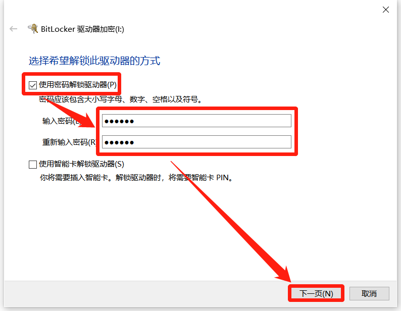 第二步:勾选“使用密码解锁驱动器”,在下方设置密码,点击“确定”。