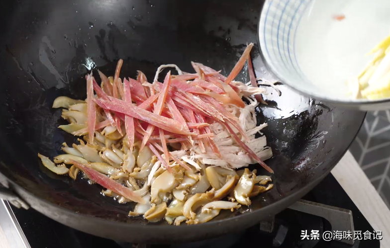 5、炒锅里倒油,加入切好的鲍鱼片,翻炒几下后倒入鸡胸肉丝、火腿丝,小火翻炒均匀,撒一点点水,不要让锅太干了。