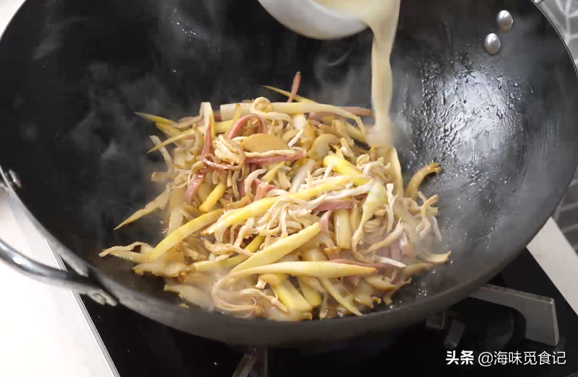 6、翻炒大概一分钟后,倒入罗汉笋丝,放一勺生抽,继续翻炒。然后把之前煮鲍鱼剩下的鲍鱼汁倒入锅内,加少许盐、一小勺白糖和一小碗水淀粉,翻炒收汁,最后加一点胡椒粉翻炒均匀就可以出锅了~