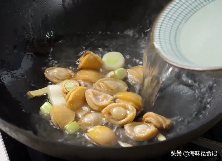 2、炒锅下油,倒入生姜片和大葱段煸炒出香味,把准备好的鲍鱼下锅翻炒,加入一大碗清水,大火煮开,调中小火炖煮半小时。