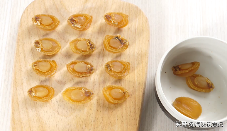 4、鲍鱼干煮好之后捞起来,剩下的鲍鱼汁不要倒掉,倒在一个小碗里备用。把煮好的鲍鱼切成片。
