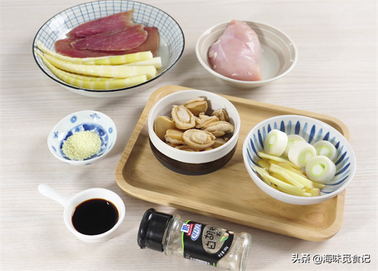 鲍鱼干、鸡胸肉、火腿、罗汉笋、大葱、生姜片、生抽、白糖、胡椒粉