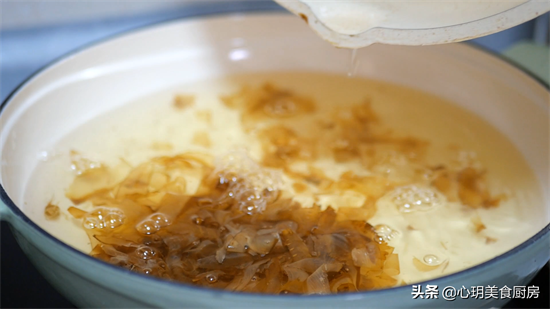 6、那么这个时候将残余的汤水倒入到另一个锅里面,如果喜欢豆腐的口感老一点,就和我一样先放,喜欢嫩一点最后放。锅内的汤水一沸腾,就可以把裙带菜下下去,沿着锅的边缘将我们刚刚调好的味噌汤倒进去,这个时候就不需要盖盖子,稍微给它煮2-3分钟,沸腾以后就可以关火了出锅了。