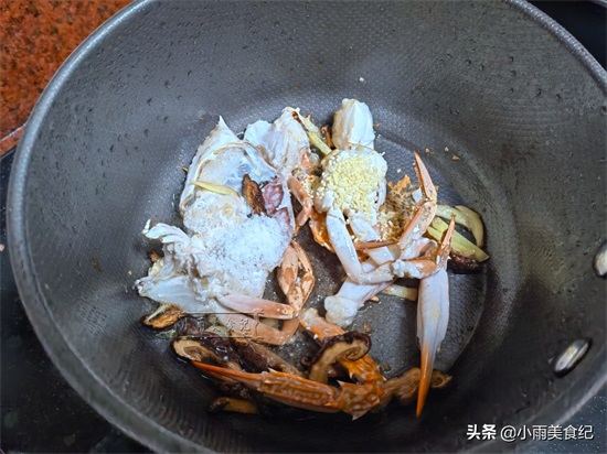 6、紧接着放入切好的姜丝和香菇进入锅中,同螃蟹一起炒至,炒出生姜和香菇的香味,姜丝可以很好地起到去除腥味的作用。