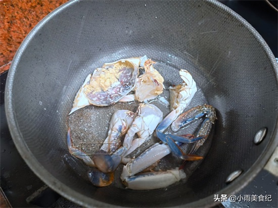 5、取出熬粥的锅,擦拭干净之后,倒入适量的食用油加热,加热至六成熟左右的时候放入切好的螃蟹进入锅中,稍微炒一下。
