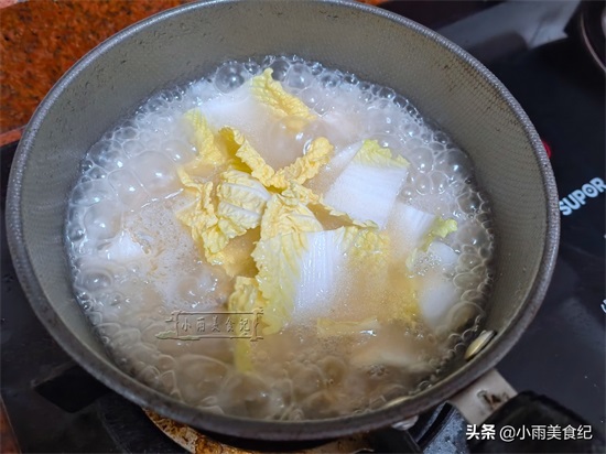 10、煮至沸腾之后,放入切好的娃娃菜,因为菜很容易煮熟,在最后放入就可以了,太早放入容易煮烂。