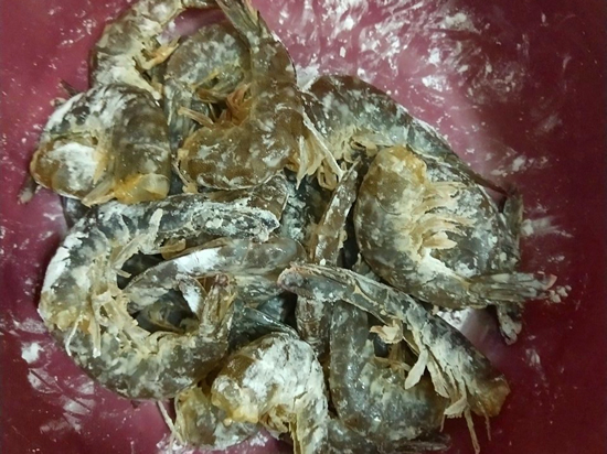 1、准备好大虾,挑出虾线,清洗干净,把虾仁放入碗中,加入料酒、食盐和姜片,腌制20分钟,去腥入味,重新洗净,撒入一小把淀粉,翻拌均匀。
