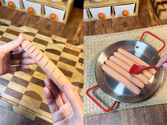 1、准备几根火腿肠,还记得常吃的那种淀粉火腿肠吗?烤出来最好吃,大街上卖2元一根,准备工作很简单,剥掉外皮,斜着切花刀,