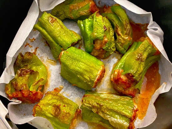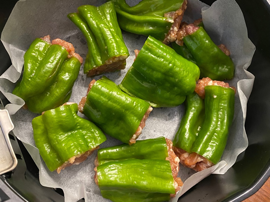 2、准备几个饱满的青辣椒,一切三半,清洗干净,小心别弄变形了,用筷子把肉塞进来,孰能生巧,多试几次就会了,底部铺一层吸油纸,放入空气炸锅中。
