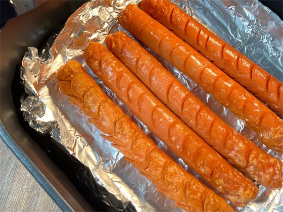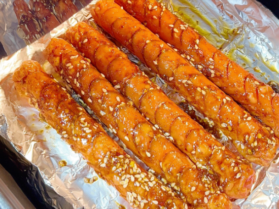 3、等听到“叮”的一声,打开炸锅,取出火腿肠,刷上调好的蘸料,再重新盖盖,还是180度,继续烤6分钟即可,成品鲜香味美,外酥里嫩,看着就有食欲,下酒又下饭。