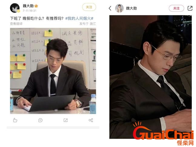 后期直播宣传中,更是开启听劝模式,戴上金丝眼镜,少说话,俨然一副霸道总裁的模样。但是魏大勋本人憋不住,根本憋不住!!!微博宣传丝毫不浪费这身妆造,积极营业,不少人一改对魏大勋在综艺上的印象。