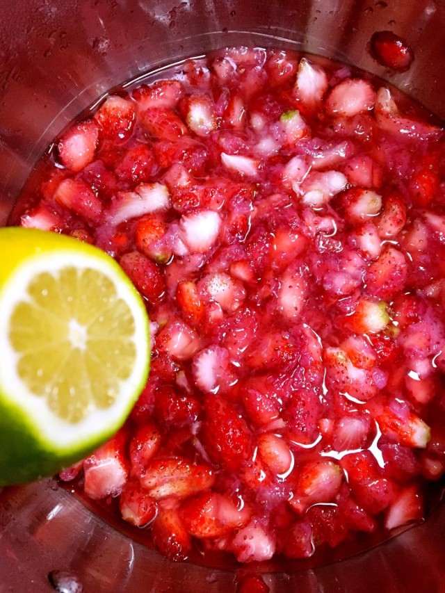 腌制了一晚上,草莓中的汁都泡出来了。准备一个柠檬,挤汁备用。因为柠檬的味道非常酸,有人就会问“不加柠檬可不可以”?不加也是可以的。不过,还是比较推荐放柠檬的。