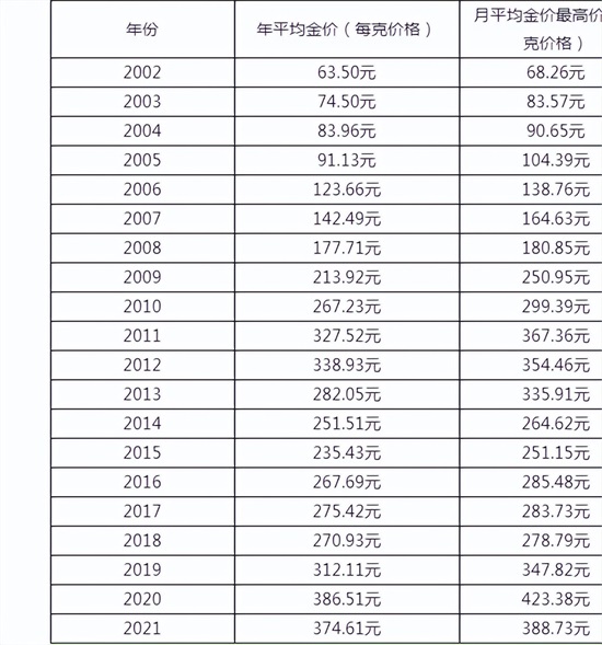 从近20年的时间里黄金价格的变动整体趋势看,黄金价格几乎出现了单边上涨的情况,从2002年的年度黄金平均价格每克63.5元上涨到2021年的每克374.61元,上涨了4.7倍。从这一意义上讲,投资购买一定的黄金确实能够保值增值。