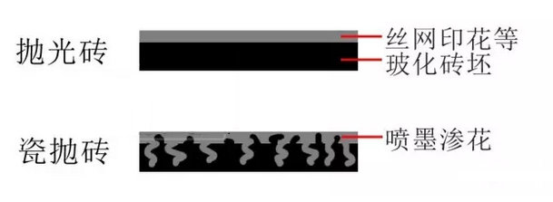 瓷抛砖和抛光砖一样都属于无釉砖,但其更为高端,采用喷墨渗花工艺,能够渗透到瓷砖相当的深度(坯体+精细粉料、渗透墨水、助渗剂)。