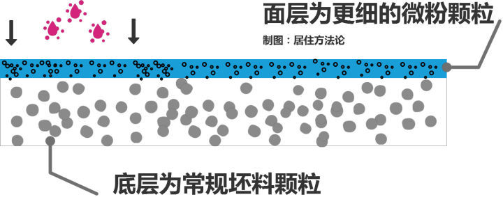 微粉石,表面额外加一层3-4mm厚的更细的粉料层,经过数千吨位的压机与底坯压制在一起。