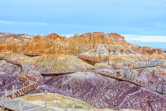 库木塔格沙漠风景名胜区位于库木塔格沙漠,面积2500平方公里,位于新疆鄯善老城南端,是世界上少有的与城市零距离接触的沙漠,也是与天池、博斯腾湖并列的新疆3处国家重点风景名胜区之一,以风沙地貌类型齐全、沙丘的轮廓清晰、层次分明为风景特征。库木塔格在维吾尔语是“沙山”的意思,库木塔格沙漠即是“有沙山的沙漠”。雄浑的大漠风光和 蓝天辉映相间,厚重的历史沉淀与西域文化默然相许,金色的沙漠依偎着绿洲守望家园,构成了一幅与大自然和谐共存的精美画卷,奏响了一曲浑然天成,金色涌动的天籁乐章。