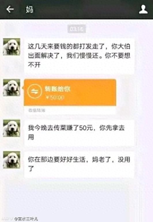 他的母亲只好一边做川菜服务员,一边应付债主,为了安慰儿子,还时不时转几十块钱给他。